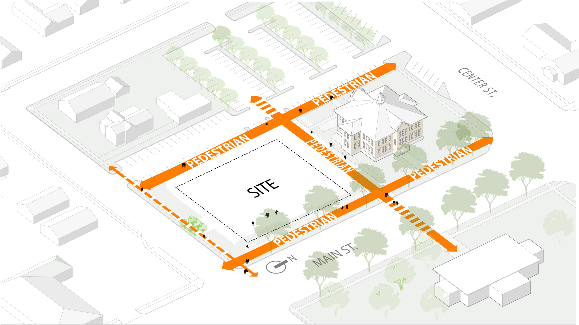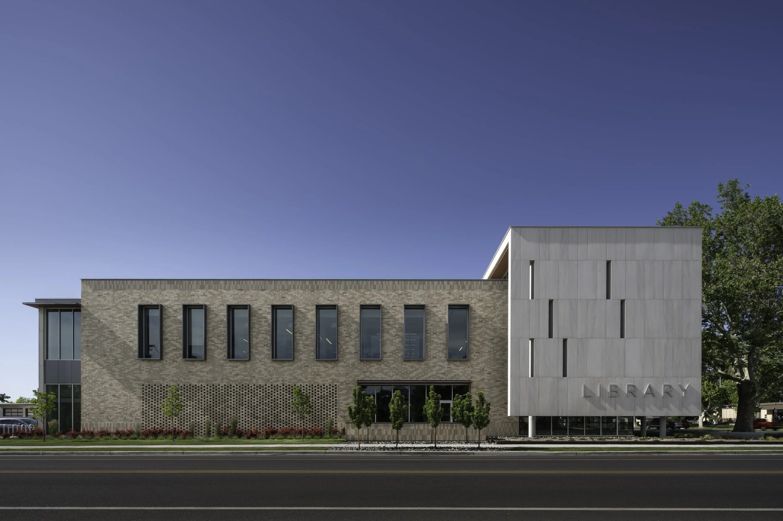 The final building design features large light toned brick masses punctured by slender rhythmic windows, both of which are features that pay homage to the adjacent historic Thurber School. These masses are contrasted by more contemporary large spans of glass that allow an abundance of natural light to filter into the library spaces. Slender roof planes cap the glass and hover over the brick walls, allowing for a cohesive bridging between traditional and modern elements.